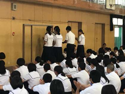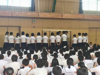 まず、校長先生より先日行われた、「大阪市中学校体育連盟春季総合体育大会」で入賞した、陸上競技部と女子バスケットボール部の表彰がありました。