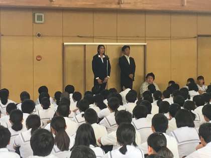 その後本日より本校に来ていただいた、保健体育科の西村先生の紹介と先生からの「着任のあいさつ」がありました。
