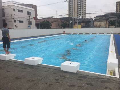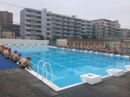 格技室で準備体操とトレーニングをし、プールに移動しました。