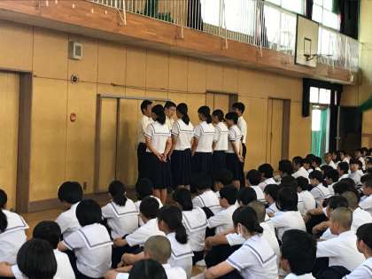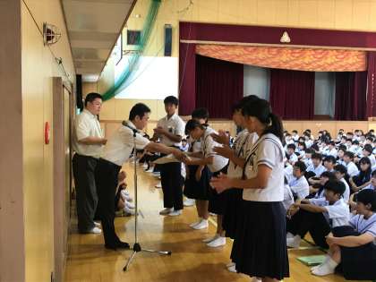 陸上競技部の表彰があり、その中の3名が、全国中学校総合体育大会の参加標準記録を突破し、出場を決めました。