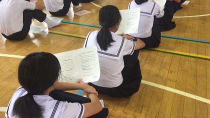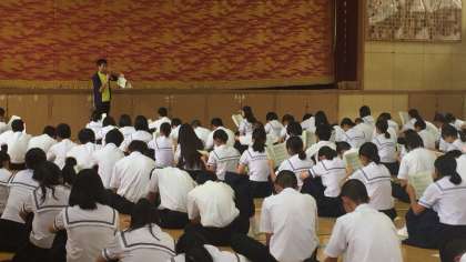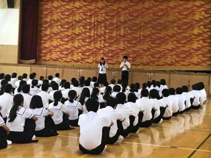 3年生の学年集会では、各クラスの学級代表より1学期を振り返っての反省と、夏休みの目標が報告され、その後先生より夏休みのしおりに沿ってお話がありました。