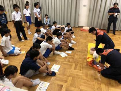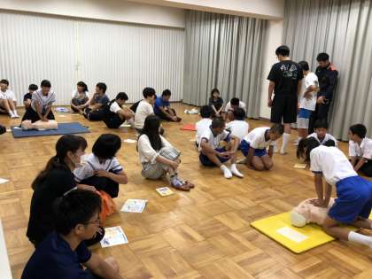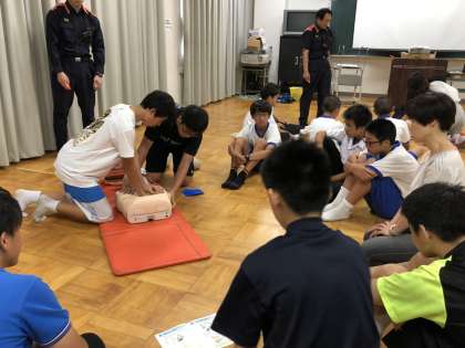 午後から住吉消防署 救命研修係の方に来ていただいて、教職員と運動部代表者(各部活3名程度)を対象に、AEDを使用した救急救命法の実習を行いました。