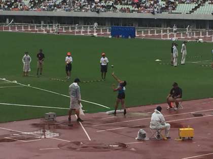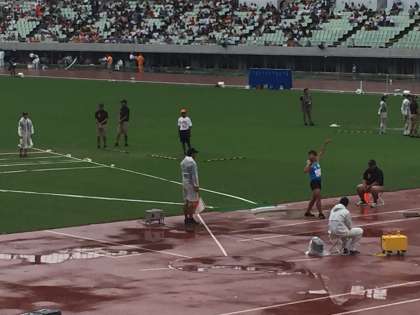 写真は男子砲丸投げの大野君の様子です。雨でサークルが滑りやすく投げにくい中、頑張っています。