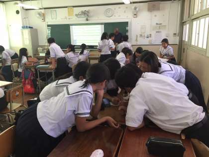 クイズ形式の英語で書かれた問題を見て、班で相談しながら答えています。