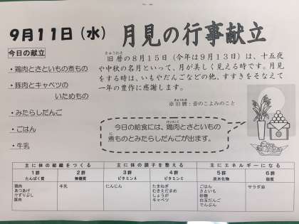 旧暦の8月15日(今年は9月13日)は、十五夜や中秋の名月といって、月がとても美しく見える時です。月見をする時は、いもやだんごなどの他、すすきをそなえて一年の豊作に感謝します。