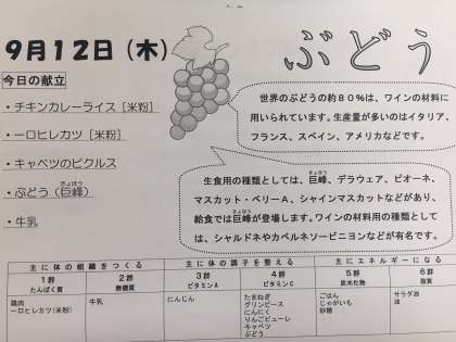 生食用の種類としては、巨峰、デラウェア、ピオーネ、マスカット・ベリーA、シャインマスカットなどがあり、給食では巨峰が登場します。ワインの材料用の種類としては、シャルドネやカベルネソービニヨンなどが有名です。