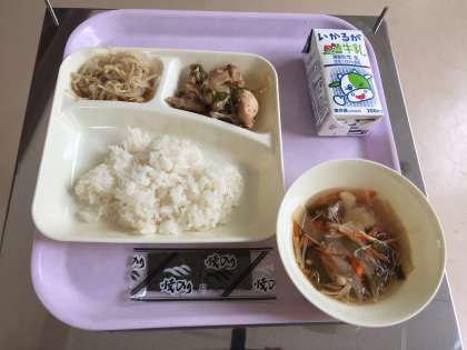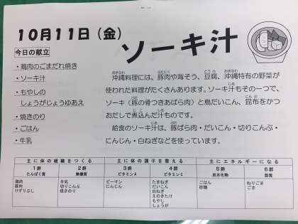 給食のソーキ汁は、豚ばら肉・だいこん・切りこんぶ・にんじん・白ねぎなどを使っています。