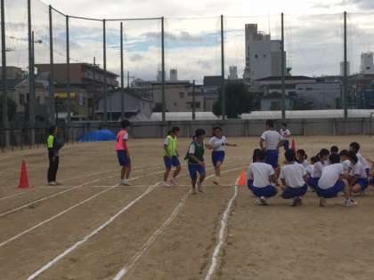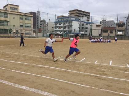 走る順番やバトンパスの位置などを工夫しながら全員で走ります。