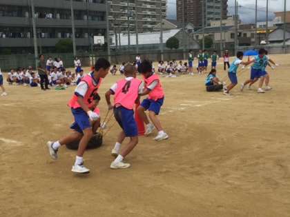 写真中段は、タイヤに学級旗を立ててゴールになります。