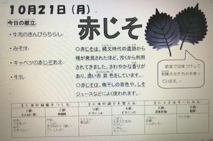 〇赤じそは、縄(じょう)文(もん)時代の遺(い)跡(せき)から 種が発見されたほど、古くから利用されてきました。さわやかな香(かお)りが あり、濃(こ)い赤(あか)紫(むらさき)色(いろ)をしています。