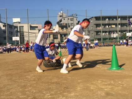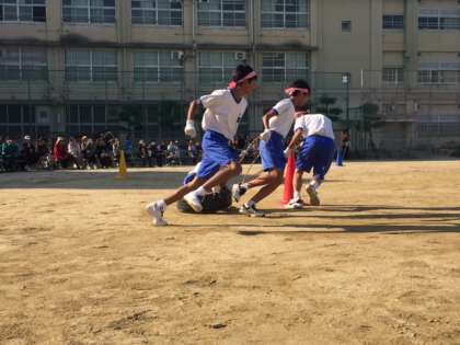 4人一組で、タイヤの上に乗った人を3人協力しながらが引っ張って、コーンの周りをまわります。