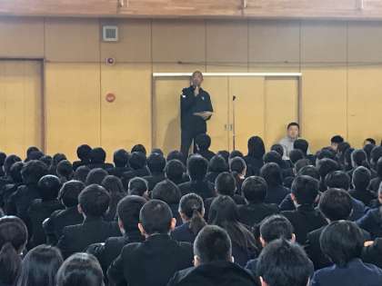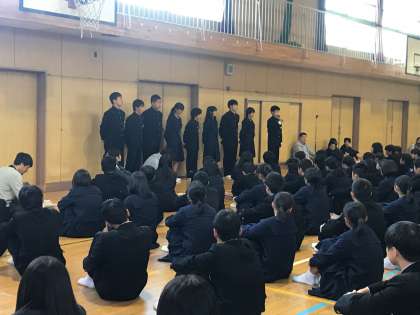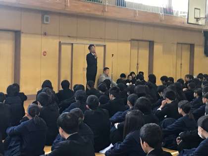 本日朝、体育館で全校集会を実施しました。