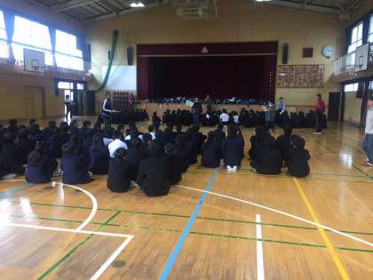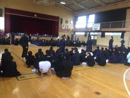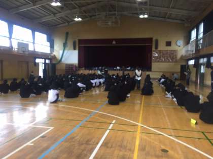 本日6限、1年生は体育館で校外学習の事前指導を実施しました。