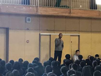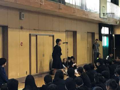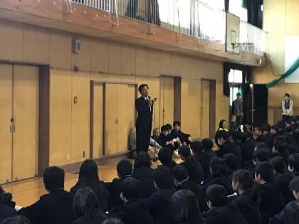 賞状伝達の後校長先生のお話、生徒会役員からの連絡があり、最後に生徒指導主事の上野先生よりお話がありました。