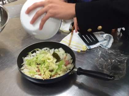 白菜やタマネギを包丁で切り分け、フライパンに敷き詰めています。
