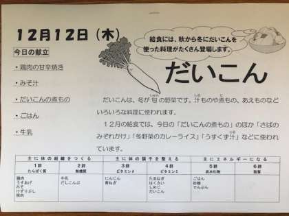 12月の給食では、今日の「だいこんの煮もの」のほか「さばのみぞれかけ」「冬野菜のカレーライス」「うすくず汁」などに使われています。