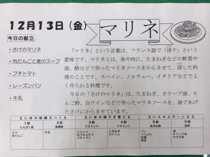 今日の「さけのマリネ」は、たまねぎ、オリーブ油、りんご酢、白ワインなどで作ったマリネソースを、油であげたさけにからませています。