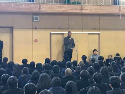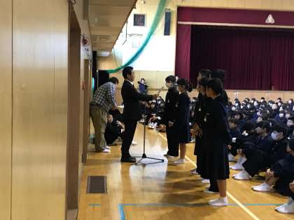 校長講話の後、学級旗コンクールの表彰があり、最後に上野先生から冬休みに向けての諸注意がありました。