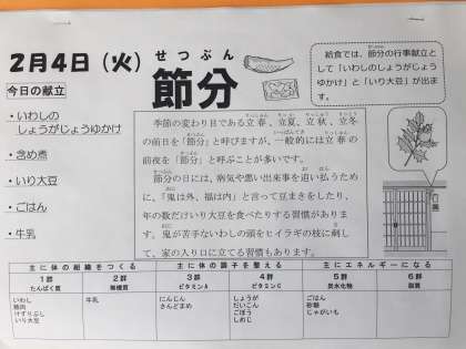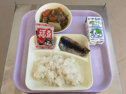 給食では、節分の行事献立として「いわしのしょうがじょうゆかけ」と「いり大豆」が出ます。