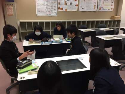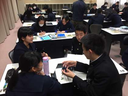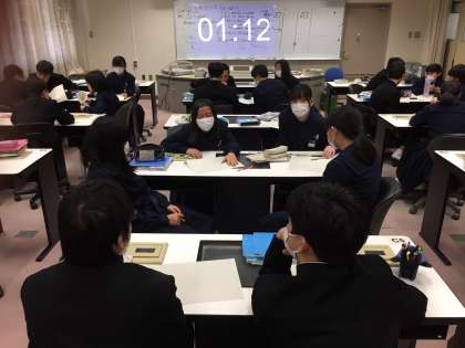 「学校に携帯電話を持ってきてもよいのか」という題で、「良い」「いけない」「審判」の3つのグループに分かれて、英語でディベートの授業をしています。
