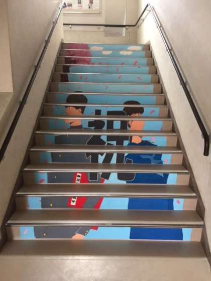 2年生は学活の時間などを利用し、卒業式に向けてアート委員を中心に、全員で階段アートを製作しました。