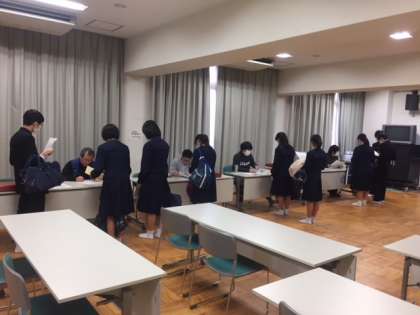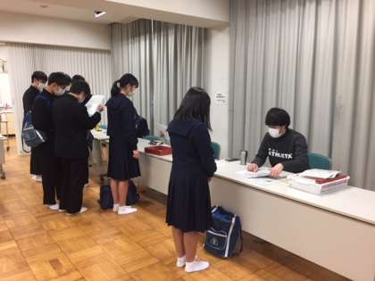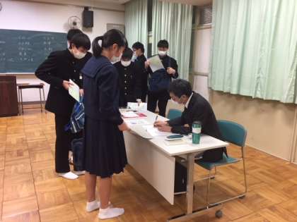 まず進路指導主事に受検票を見せ、受検番号を報告後、担任の先生の所へ行き報告をしています。