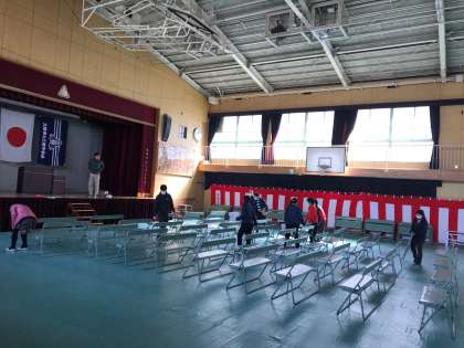 教室で担任の先生より配付物を受け取った後、体育館で卒業式の座席や次第の説明をします。