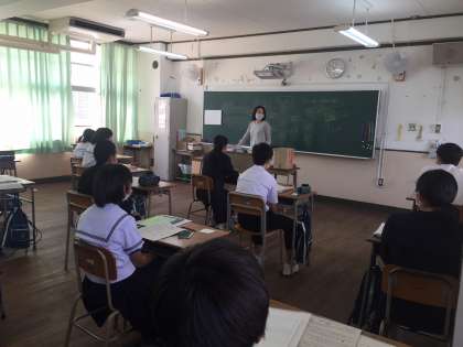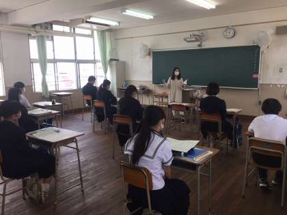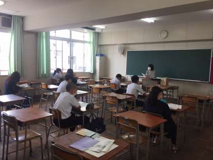 クラスを3分割し、学校全ての教室を使用して15教室に分かれ、担任の先生からのお話や課題の確認をしました。