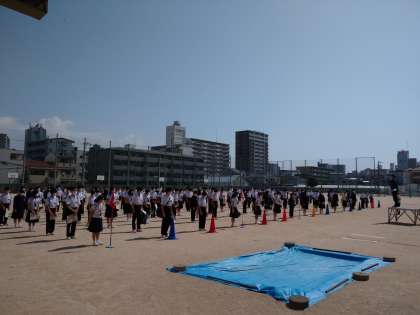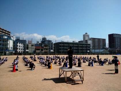 玄関ホールで手指消毒をしてクラス発表のプリントをもらい、新しいクラスで出席番号順に3列で並びました。