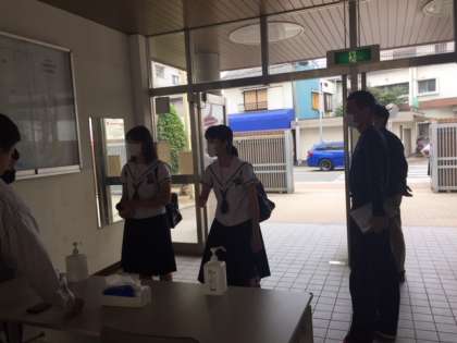 登校してきた生徒は手指消毒をし、検温してきているか確認をしています。