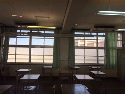 午前中太陽の光が差し込み、教室の温度が上がるので、快適に学習ができるようにと、ひと教室ずつ順番に「すだれ」をかけてくれています。