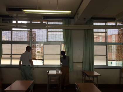 管理作業員さんが、3年生校舎教室の東側の窓に「すだれ」をかけてくれています。