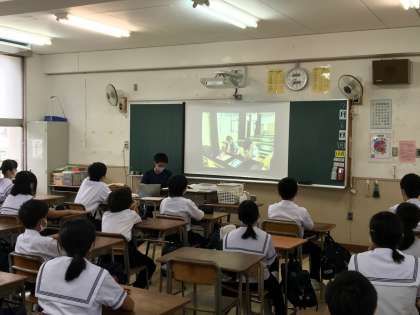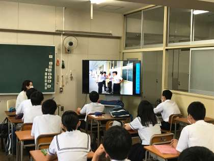 写真は生徒会執行部の生徒が、パワーポイントを使いながら事例を紹介している様子です。