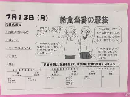 給食当番は、服装を整えて、衛生的に給食の準備をしましょう。