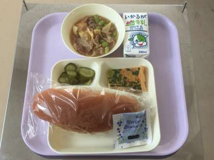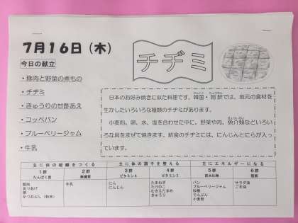 小麦粉、卵、水、塩を合わせた中に、野菜や肉、魚介類などいろいろな具をまぜて焼きます。給食のチヂミには、にんじんとにらが入っています。