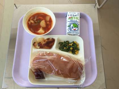 給食には食パン、コッペパン、おさつパン、ライ麦パン、黒糖パン、レーズンパン、パンプキンパンなどがつきます。