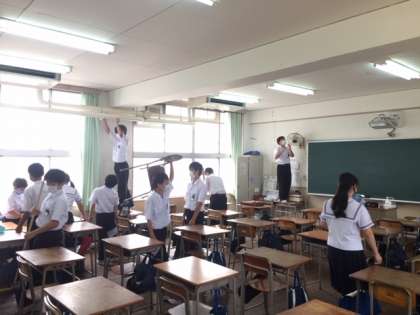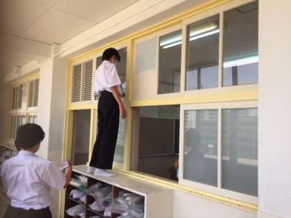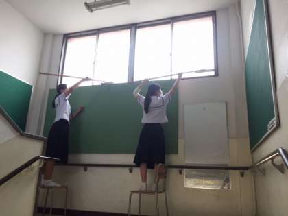 ガラス窓や扇風機、エアコンフィルターなど、1学期間の汚れをきれいに掃除しています。