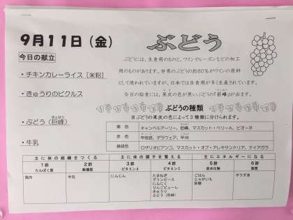 今日の給食には、果皮の色が黒いぶどうの「巨峰」が出ます。