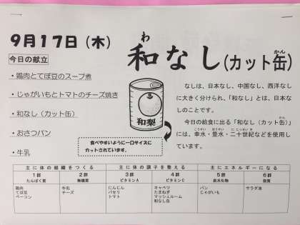 今日の給食に出る「和なし(カット缶)」には、幸水・豊水・二十世紀などを使用しています。