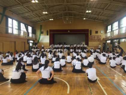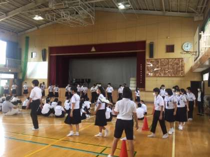 1限目は、当日住吉区民センター実施するので、体育館でクラス毎の舞台への出入りを確認し、練習しています。