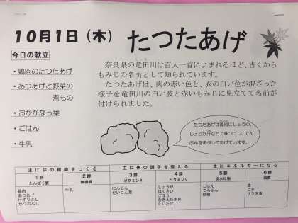 たつたあげは、肉の赤い色と、衣の白い色が混ざった様子を竜田川の白い波と赤いもみじに見立てて名前が付けられました。
