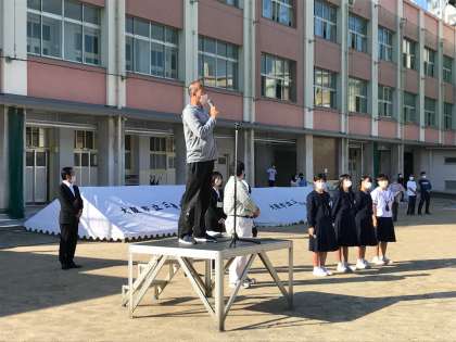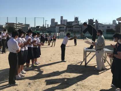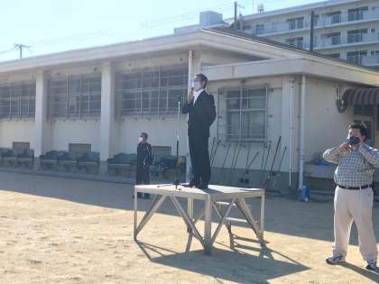 陸上競技部の賞状伝達の後、校長先生、生徒指導主事の上野先生からお話がありました。