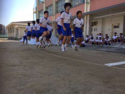 クラスをA・B・Cの3チームに分け、それぞれ1分間に連続で何回跳べるかを記録し、3チームの合計で順位を決めます。