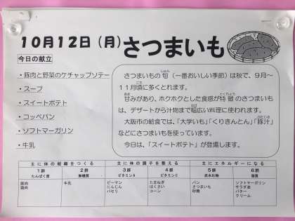 大阪市の給食では、「大学いも」「くりきんとん」「豚汁」などにさつまいもを使っています。