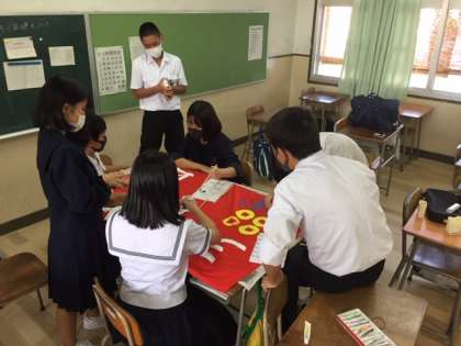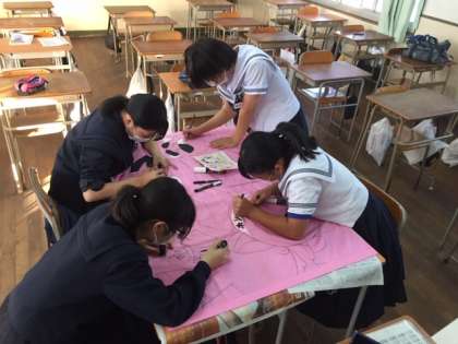 放課後に有志の生徒が集まって、学級旗づくりをしています。