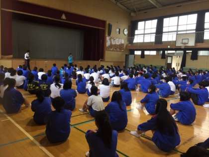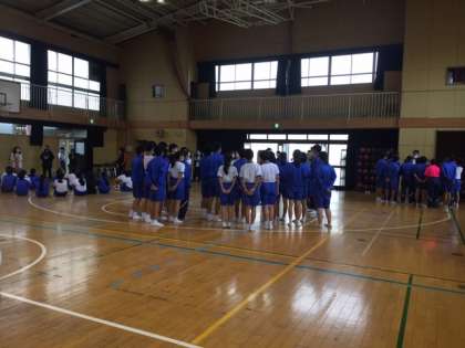 体育館で係生徒が集合し、その後、各係に分かれて担当の先生より説明を受けています。