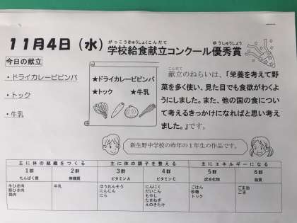 本日の献立は学校給食コンクール優秀賞の献立で、昨年の新生野中学校の1年生の作品です。
