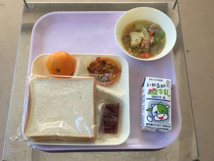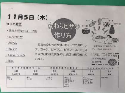 給食ではピザ生地の代わりに、ギョーザの皮を使います。