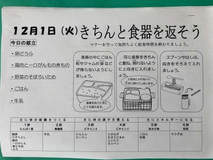 (マナーを守って気持ちよく給食時間を終わりましょう。)