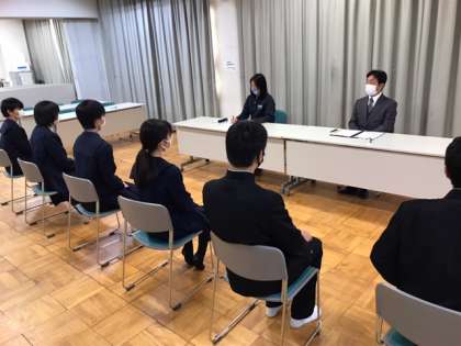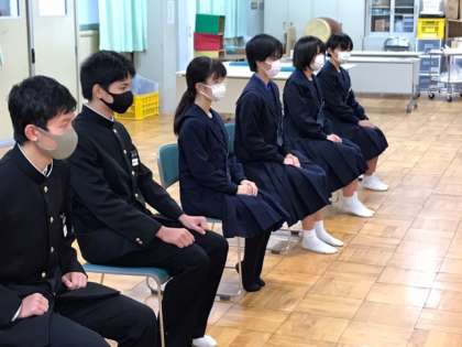 校長先生からの「中学校で頑張ったこと」や「一番思い出に残っていること」、「高校を選んだ志望理由」や「入学してから頑張りたいこと」、「将来の夢」や「尊敬している人」などの質問に対して真剣に答えていました。
